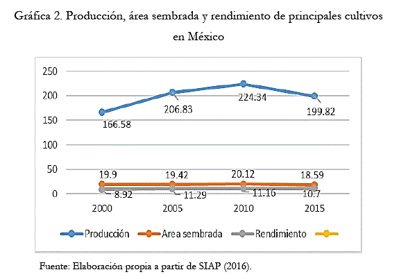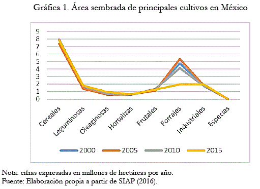 De los ocho grupos vegetales cultivados en México, los cereales, las hortalizas y los frutales cubren 65% del área cultivada; lo que no es de extrañar, ya que, desde tiempos ancestrales los cereales, hortalizas y frutales son la base de la alimentación en México, y actualmente, aun cuando 202 especies son explotadas con fines alimentarios, son los cultivos de maíz y de frijol los que cubren el 44% del área cultivada (8.015 y 1.774 millones de hectáreas, respectivamente) (Sosa, 2017). La Gráfica 1 muestra la producción de los principales cultivos en este país.