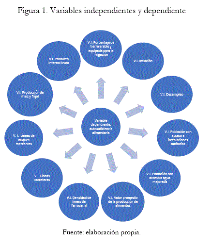 En la investigación se toma como variable dependiente la tasa de autosuficiencia alimentaria. Para las variables independientes se diseñaron 11 variables con información sobre: 1. Porcentaje de tierra arable y equipada para la irrigación; 2. Valor promedio de la producción de alimentos; 3. Densidad de líneas de ferrocarril; 4. Líneas carreteras; 5. Líneas de buques mercantes; 6. Producción de maíz y frijol; 7. Producto Interno Bruto; 8. Desempleo; 9. Inflación; 10. Población con acceso a agua mejorada y 11. Población con acceso a instalaciones sanitarias. Para una mejor interpretación, puede verse la siguiente figura 1: