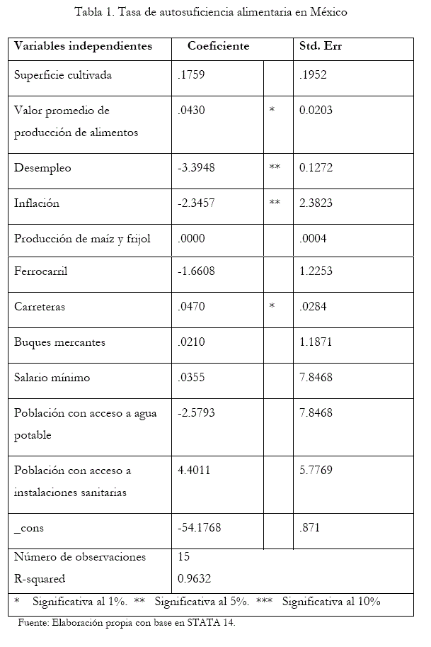 A partir de las dimensiones de la seguridad alimentaria propuestas por la FAO, fue posible estimar estas dimensiones y su influencia sobre la autosuficiencia alimentaria, como un indicador de la seguridad alimentaria en México. Esto permitió reforzar el método cuantitativo utilizado en la metodología, así como la importancia que tiene la autosuficiencia alimentaria como estrategia de seguridad alimentaria para el país.