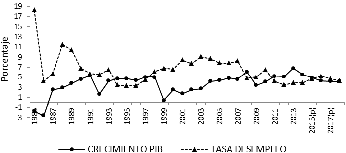 La relación negativa o inversa entre el PIB y el desempleo (Ley de Okun [8] ),  no se presenta en el caso de nuestro país, es decir, el crecimiento del PIB que debería ir acompañado de una disminución en la tasa de desempleo, está ausente en el período estudiado.