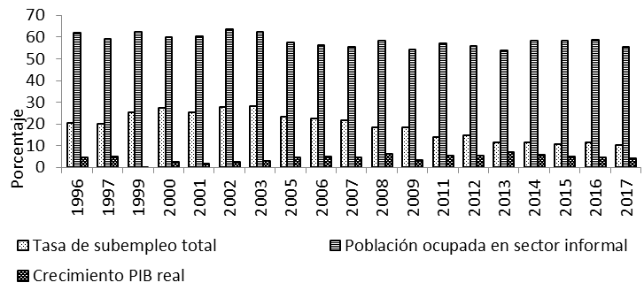 Figura 2: Relación PIB y tasa de subempleo y empleo en el sector informal 1996-2017.