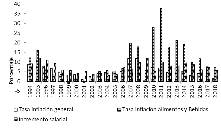 En la Figura 3 se describe el comportamiento de la tasa de inflación general y de la tasa de inflación de alimentos y bebidas, considerando el período 1994- 2018. En los 25 años de referencia, la tasa de inflación general acumulada alcanzó 133.80% y la tasa de inflación de alimentos y bebidas acumulada fue del 269,07%, es decir, esta última estuvo 135,27% por encima de la tasa de inflación general. A pesar de las anteriores diferencias sustanciales entre las tasas de inflación general acumulada y de alimentos y bebidas acumulada, el indicador de referencia utilizado para los determinar los incrementos salariales fue el primero.