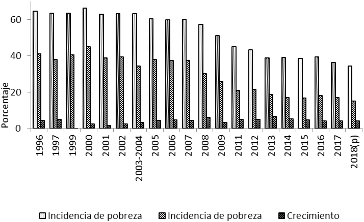 Figura 4. Crecimiento del PIB real, incidencia de pobreza moderada e incidencia de pobreza extrema, período 1996-2018. (p): Preliminar
