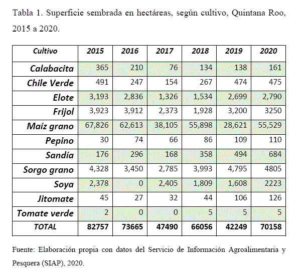 Como podemos observar, la superficie sembrada ha ido disminuyendo, teniendo el mínimo de hectáreas sembradas para el año 2019. Del año 2015 al 2019, la superficie sembrada disminuyó el 51.05%. En 2020, la superficie sembrada recupera su extensión en la mayoría de los cultivos. El producto que más superficie sembrada tiene es el maíz en grano, el sorgo en grano, elote y soya, productos que implementan el paquete tecnológico. Los productos que menos superficie sembrada registran son el tomate verde y el pepino.