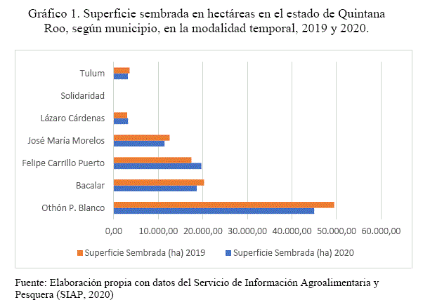 En el estado de Quintana Roo se identifican dos tipos de siembra: de riego y de temporal, siendo la de temporal la que mayor superficie agrícola ocupa y dedicándose a ella un gran número de productores. Othón P. Blanco es el municipio que más siembra en modo temporal, seguido por Felipe Carrillo Puerto, Bacalar, José María Morelos, Lázaro Cárdenas y Tulum. Solidaridad, Isla mujeres, Cozumel y Benito Juárez son municipios dedicados al turismo.