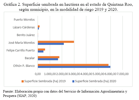 El municipio que más siembra en modalidad de riego es Othón P. Blanco, seguido por José María Morelos, Bacalar, Felipe Carillo Puerto y Lázaro Cárdenas. Los municipios que tiene menos siembra en modalidad de riego se dedica al turismo.
