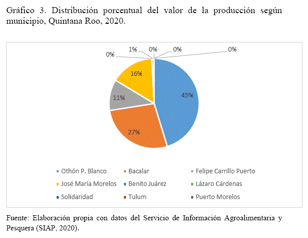 Dado que el Municipio de Othón P. Blanco es el que sobresale con la mayor superficie sembrada en ambas modalidades de temporal y riego, es de esperar que sea el que aporte el mayor valor de producción al estado. La gráfica 3 muestra que sólo Otón P. Blanco aporta el 45 % de valor de la producción agrícola.
