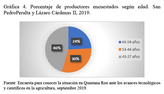La encuesta se estructuró en una parte inicial que recoge el perfil socioeconómico, dónde conocimos información detallada de los ejidatarios encuestados. En la gráfica 4 vemos que del total de encuestados en ambas comunidades, el 46 % tiene entre 43 y 27 años de edad, siendo el grupo de edad que más predomina, lo cual nos dice, que son ejidatarios entre el rango de edad laboral. Esto significa que la agricultura es la actividad al que se dedican para obtener su alimentación y un ingreso.