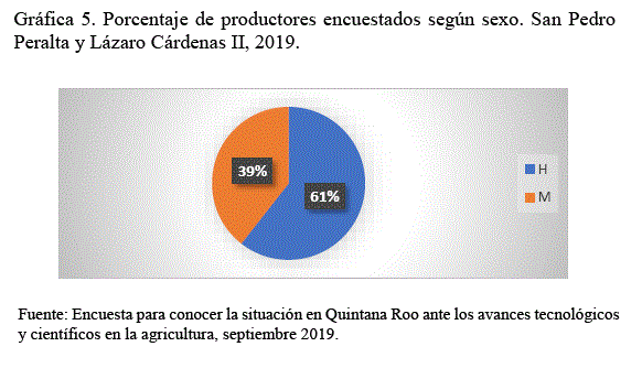 De igual forma, se hace la distinción por sexo del total de encuestados, el cual resultó en un 60.61% de hombres y 39.39% de mujeres. Este dato es importante debido a la presencia de mujeres en la producción, lo cual se complementa con los otros quehaceres, del cual la preparación de alimentos viene a ser importante para el cuidado de la nutrición y la salud. En una encuesta complementaria a esta se recolectó información sobre el consumo de la producción agrícola en estas mismas comunidades para analizar la situación de la alimentación (Bautista, Ken y Keita, 2020).