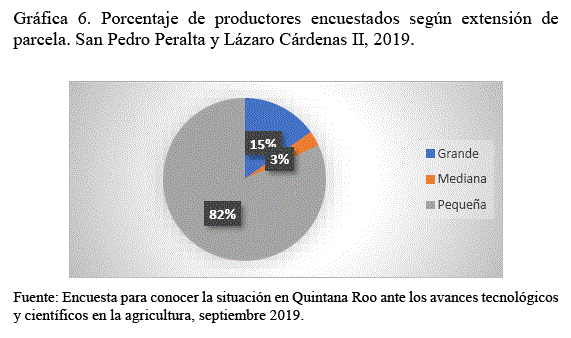 También se obtuvo la extensión del área cultivable del terreno de cada uno de los productores ejidatarios. La extensión grande se refiere cuando la parcela se encuentre entre 50 y 30 hectáreas que presentó ser un 15 %; la extensión media se refiere cuando esté está entre 29 y 15 hectáreas que presentó ser un 3 % solamente; y la extensión pequeña se refiere cuando esté ocupa entre 14 y 1 hectárea, que resultó ser la gran mayoría de los casos con un 82 %. Esto nos confirman que la mayoría práctica la agricultura de subsistencia. Sin embargo, las extensiones grandes se encontraron mayormente en San Pedro Peralta (60%).
