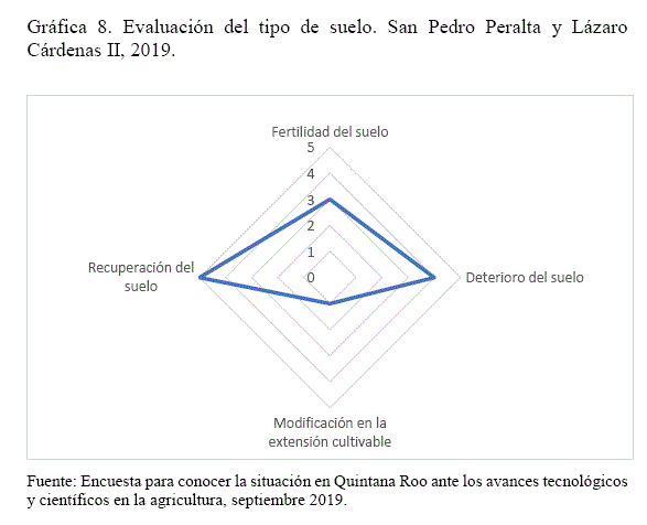 En cuanto al tipo de suelo, los productores de estas comunidades consideran que la fertilidad de sus suelos no es un factor desfavorable para sus cultivos, aunque esta variable obtuvo la más baja evaluación de la dimensión. De la misma manera, consideran que el ritmo de deterioro que este mismo ha tenido en los años más recientes es bajo, a pesar de que el suelo que predomina en el estado de Quintana Roo no es muy apto para la práctica de la agricultura.