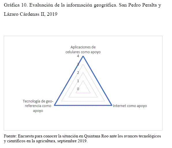 En cuanto a la información geográfica, los encuestados externaron que son necesarias las nuevas oportunidades que brindan las aplicaciones del celular, el internet y la tecnología de Geo-referencia como apoyo para su actividad agrícola, para que las conozcan y apliquen en la producción y comercialización de sus productos. Por lo consiguiente, las variables de esta dimensión obtuvieron las más altas evaluaciones.