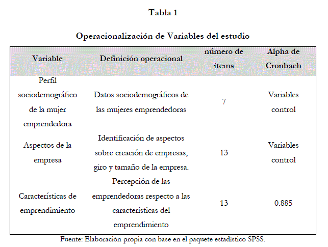 El cuestionario aplicado se divide en tres secciones: en la primera parte se identifica el perfil sociodemográfico de las mujeres emprendedoras, en  segundo lugar aspectos relativos a la creación, giro y tamaño de sus empresas y finalmente se obtiene información respecto a su percepción sobre las características del emprendimiento. La fiabilidad del instrumento se comprobó a través del Alpha de Cronbach de: 0.885 bueno. En la tabla 1 se muestran las variables del cuestionario que serán objeto de estudio en este trabajo (González y Pazmiño, 2015). Para el procesamiento de los datos se utilizaron técnicas de estadística descriptiva.