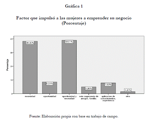 Las entrevistadas en general son micro y pequeñas empresarias con un promedio de 4 años en el ramo, el 41.8% inició su empresa en pareja, el 33.3% sola y el 24.1 en grupo (más de tres), principalmente emprenden por necesidad  y oportunidad (ver gráfica 1); el 59% de ellas se dedica al comercio de bienes y servicios.