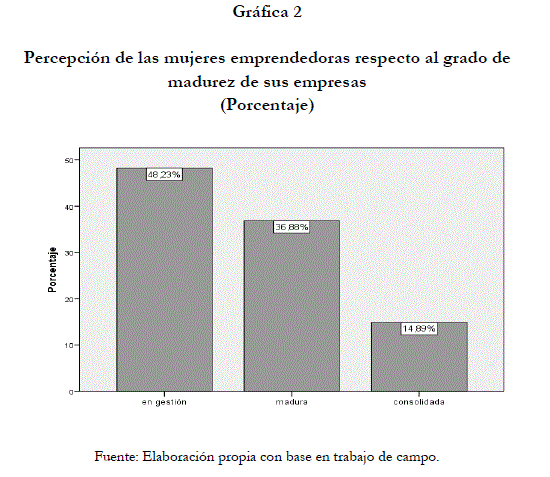 Las empresas de las emprendedoras, según su opinión, 14.9% se encuentra consolidadas, un 36.8% son empresas maduras y el resto 48.2% se encuentra en fase de gestación (ver gráfica 2). Los principales problemas a los que se enfrenta son la competencia, el financiamiento y la falta de capacitación para administrar su negocio, de hecho sólo el 28.4%  estaba tomando algún curso de capacitación al momento de aplicar el cuestionario.