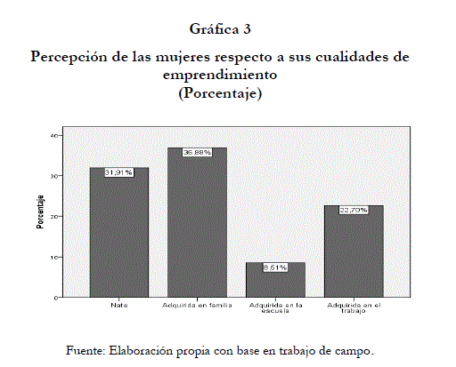 Se le preguntó a las mujeres empresarias en relación a cómo consideraban el emprendimiento, el 32% lo considera como una cualidad nata y el 37% adquirida en familia (ver gráfica 3).