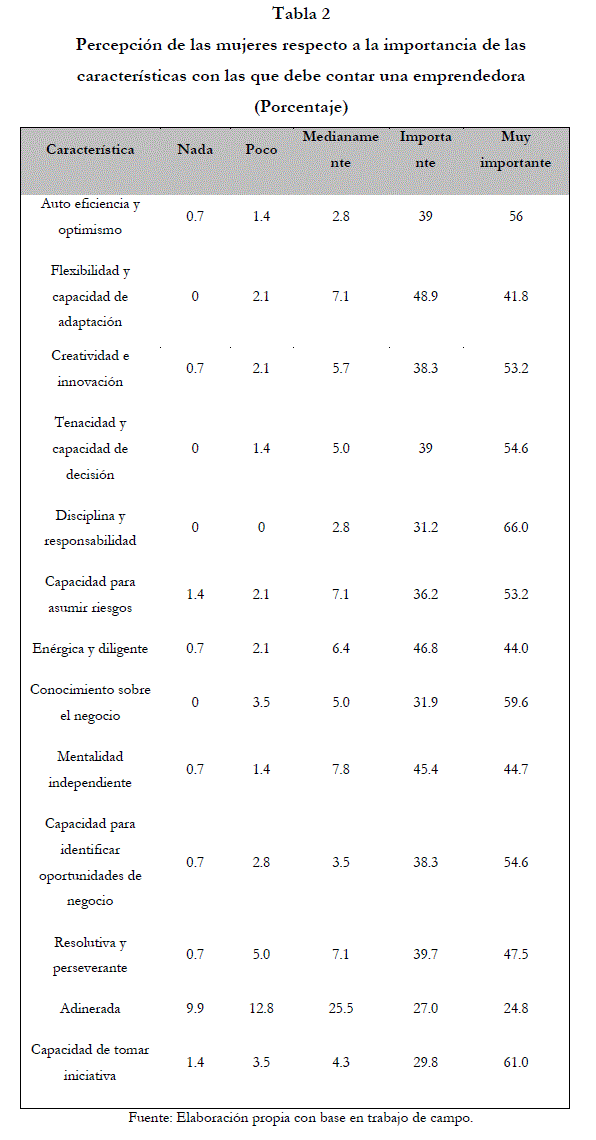 Se encontró que la media de cada característica  se localiza en el nivel 4, es decir la mayoría de las mujeres emprendedoras considera muy importantes las cualidades de emprendimiento como creatividad, tenacidad, disciplina, responsabilidad, entre otras, excepto en el caso de adinerada cuya media se encuentra en la escala 3, medianamente importante.