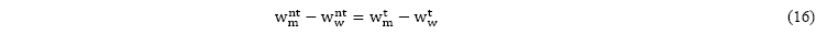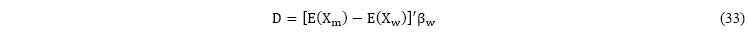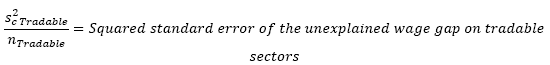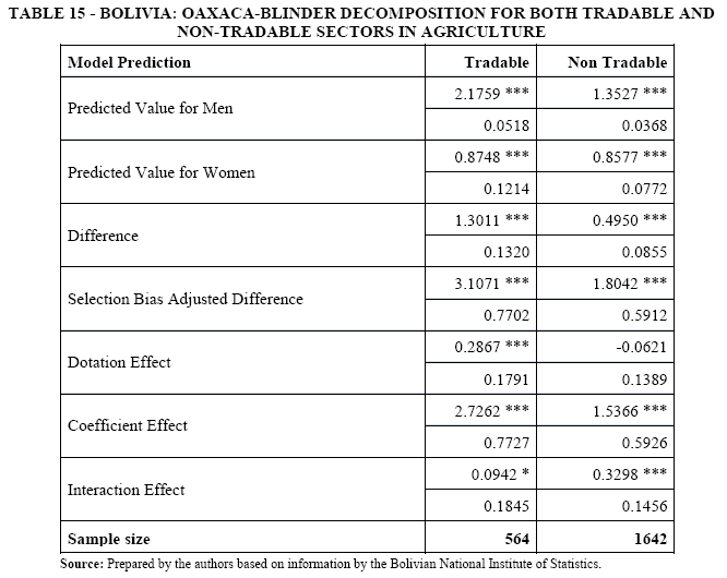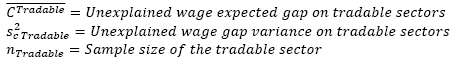 At first sight it can be observed that the predicted value for men on low tradability sectors is 2.2259 and women have an expected value of 0.7474. The gap at such level is 1.4785 and with a selection bias correction the gap is 3.7848. At the same time it can be observed that the gap is mostly explained by the coefficient effect thus showing that the gender wage gap cannot be explained by factors that influence productivity.