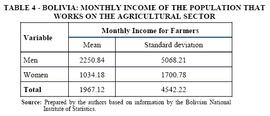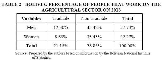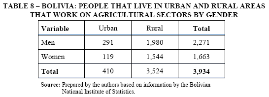 As we can observe in Table 1, 2 and 3, using the study made by Molina [1] as a comparison point it can be observed that there has been a reduction on the amount of people that work on this sector. On 2002 there were 4,884 people that worked on this sector but on 2013 there are only 3.934. This is corroborated by the information the Bolivian National Institute of Statistics released as on 2002 a 42.26% of the population worked on agriculture but this number reduced as on 2009 only a 31.77% of populations worked on this sector.