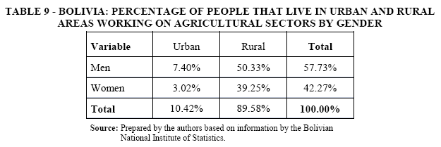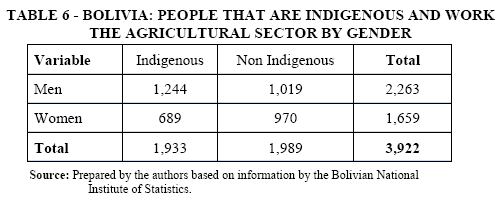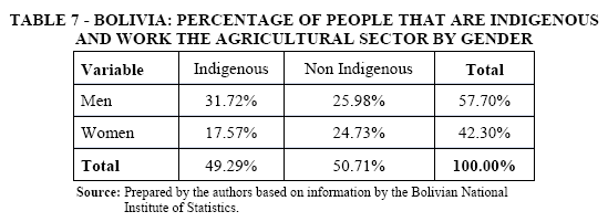 Viewing Tables 6 and 7 it can be observed that are slightly more men working on the agricultural sector than women, as there are 57.70% men working on this area and only 42.30% women. The division of indigenous and non-indigenous shows that there almost the same number of people belonging to these groups.