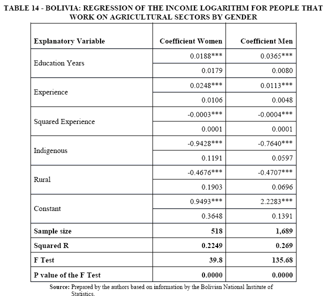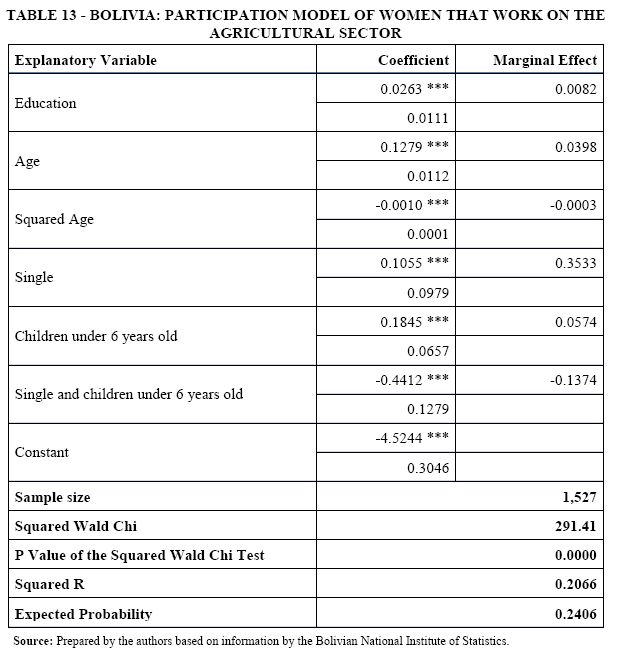 There are some investigations that study inequities in Bolivia. Yañez[41] made and analysis based on labor economics and includes certain variables to this analysis as Bolivia presents some unique characteristics such as a very strong informal market. This affects the obtained results for example is it more likely for a woman to participate in the labor market than a man. This was made in a logit model which studied the probability of getting a job based on different characteristics that may have influence. Something worth mentioning is the fact that even if a woman is more likely to get a job the expected wage she would receive for job would lower than a mans wage.