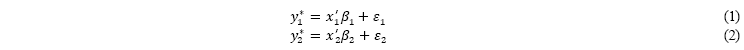 El modelo biprobit es una extensión en múltiples ecuaciones del modelo de regresión probabilístico, probit, en el que se considera un sistema de ecuaciones cuyos errores están correlacionados. El modelo trabaja con dos variables dependientes latentes, las cuales no se observan directamente, sino que son inferidas a partir de variables binarias observables. Las variables dependientes son dicotómicas y reflejan decisiones individuales de respuestas cerradas. Estas variables son representadas de la siguiente forma: