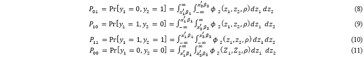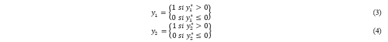 Para establecer el modelo probit bivariado, en el cual se abarque tanto la ecuación (1) y (2), se debe considerar los siguientes cuatro casos posibles.