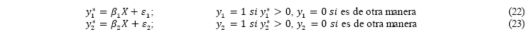 es el coeficiente de correlación entre las dos ecuaciones. De esta manera, el modelo permite observar la correlación entre las dos variables dependientes y si ésta resulta insignificante, entonces se podría estimar dos modelos probabilísticos independientes. En el caso contrario, se debe usar un modelo probabilístico bivariado.