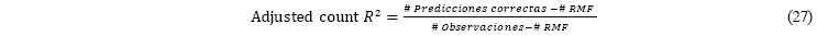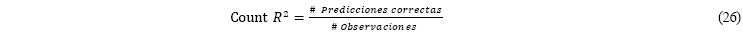 Una vez obtenidos los resultados del biprobit, se probó la bondad del ajuste del modelo para saber cuan bien éste se ajusta al conjunto de observaciones. Las medidas de bondad en general resumen la discrepancia entre los valores observados y los valores predichos por el modelo. La prueba Count R-Squared trata cualquier registro con una probabilidad pronosticada de 0,5 o mayor como tener un resultado predicho de 1 y cualquier registro con una probabilidad predicha menor a 0,5 como tener un resultado predicho de 0; en este sentido, los valores predichos que coinciden con los reales se contabilizan como predicciones correctas, y el estadístico calculado es: