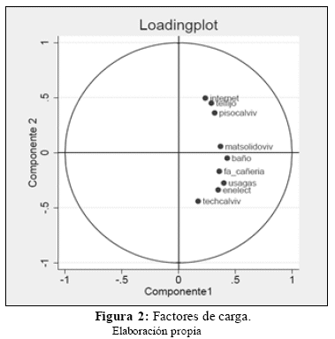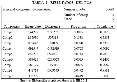 3.2 Análisis en Componentes PrincipalesEn nuestro modelo, la medida del ingreso reportada en la encuesta de hogares presenta un problema de endogeneidad, dado que la participación del adolescente en el mercado laboral depende de los ingresos del hogar y al mismo tiempo éstos están en función al ingreso que trae a casa el adolescente. Para intentar aliviar este problema optamos por construir un índice que capture el ingreso del hogar en las características del domicilio, por ejemplo, el material de la construcción, el acceso a servicios públicos, etc. La idea básica es que, si bien el trabajo adolescente aporta al ingreso del hogar, es poco probable que afecte en gran medida estas características que uno supondría son definidas previamente a la toma de decisión de trabajar del adolescente. No existe una manera de demostrar este supuesto, y no es posible saber si el problema de endogeneidad ha sido totalmente eliminado, pero debería por lo menos ser atenuado por este procedimiento. Por otro lado, si nuestro modelo predice que el ingreso de la familia aumenta la probabilidad de estudiar en vez de trabajar, y que el trabajo adolescente aumenta el ingreso, entonces el coeficiente del ingreso familiar estaría sesgado hacia abajo, subestimando el verdadero efecto.
