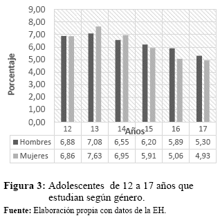 En la Figura 3 se muestra el porcentaje de menores que solo se dedican a estudiar; se observa que hasta los 14 años son las mujeres quienes tienen porcentajes más altos de asistencia escolar, a partir de los 15 años son más los hombres que se dedican a estudiar que las mujeres, no obstante, a partir de los 13 años se puede ver una disminución general del porcentaje de menores que solo se dedican a estudiar, lo que quiere decir, que sin importar el género, a medida que los adolescentes incrementan su edad son menos los menores que sólo se dedican a estudiar.