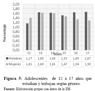 En la Figura 4 se observa los menores que únicamente se dedican a trabajar, el gráfico muestra que en todas las edades excepto en la de 12 años, son más los menores de género masculino que sólo trabajan que las mujeres. Por otra parte, que a medida que los adolescentes hombres aumentan de edad también aumentan el porcentaje de menores que realizan es actividad, mientras que la participación femenina no resulta muy estable no teniendo una tendencia marcada.