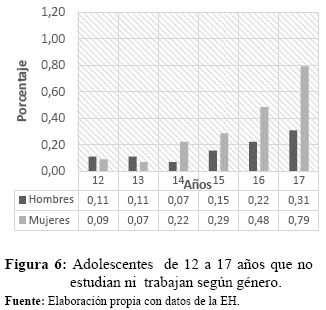 La Figura 5 muestra los menores que estudian y trabajan al mismo tiempo; se observa que en general el porcentaje de adolescentes hombres que realiza ambas actividades es mayor al porcentaje de las mujeres, sin embargo, la diferencia no es significativa, dado que, los menores hombres que se encuentran en esta categoría alcanzan el 9,28%, mientras que las mujeres representan el 8,75%. No obstante, a medida que los menores aumentan de edad son menos las mujeres que realizan ambas actividades mientras que la propensión en el caso de los hombres no está determinada. Por otra parte, la Figura 6 muestra los adolescentes que no realizan ninguna actividad, los ninis. Se observa que a partir de los 14 años a medida que los adolescentes incrementan su edad, mayor es la cantidad de ninis. Sin embargo, la cantidad de mujeres ninis es mucho más alto que de los hombres, llegando a doblar los porcentajes