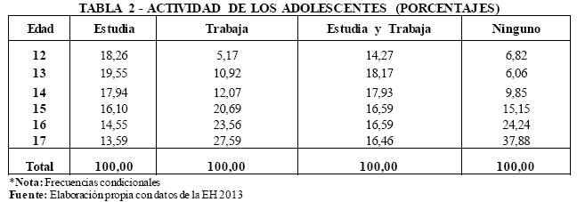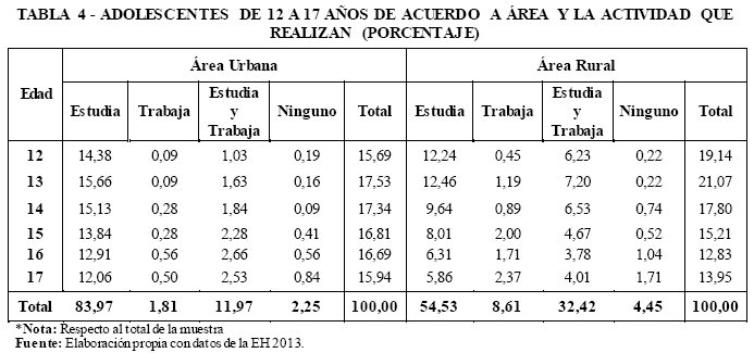 Finalmente, las actividades que realizan los adolescentes conforme al área en el que viven, se muestra en la Tabla 4. Se observa que en el área urbana el porcentaje de menores que sólo estudian es mucho más alto en la ciudad que en el área rural, en el área urbana existe un 30% más de adolescentes que se dedican únicamente a estudiar. No obstante, en ambas áreas al aumentar la edad de los menores disminuye el porcentaje de adolescentes que sólo realizan esta actividad.