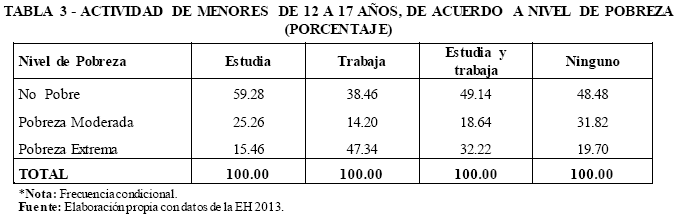 Por otra parte, la Tabla 3 muestra las actividades que realizan los menores de acuerdo a su nivel de pobreza medido en base al ingreso reportado de la familia.