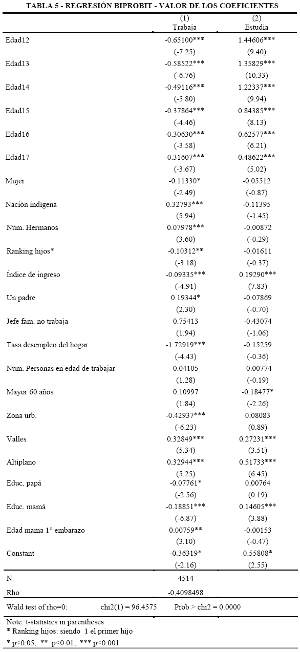 es negativo, lo que indica que existe una disyuntiva entre las dos elecciones y que estas compiten entre ellas, por lo tanto, no son independientes. Existe una relación negativa entre trabajar y estudiar dado que, determinados factores que aumentan la probabilidad de estudiar disminuyen la probabilidad de trabajar y viceversa. Sin embargo, esta correlación no es perfecta, lo que aclara que estas decisiones no son mutualmente exclusivas.