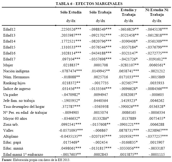 Este es el primer estudio de este tipo realizado sobre datos de Bolivia. Entre los resultados más destacados de este trabajo, encontramos que la decisión de trabajar y estudiar no es binara. Descubrimos que a medida que aumenta la edad, la probabilidad de solo estudiar disminuye en detrimento de las otras categorías. Encontramos también que los varones, los indígenas, los hermanos mayores, los adolescentes con un solo padre presente en el hogar, y aquellos que viven en el campo tienden más a combinar estudio y trabajo. Como es de esperar, el ingreso tiene un efecto importante y positivo en la probabilidad de solo estudiar, que puede estar potencialmente subestimado por los problemas de endogeneidad discutidos más arriba. Encontramos también importantes diferencias regionales, en las cuales las probabilidades de ser un nini son más fuertes en los llanos, mientras que es más frecuente trabajar y estudiar al mismo tiempo en los valles y en el altiplano. Por último, observamos que la educación de la madre tiene una influencia positiva y significativa en la probabilidad de solo estudiar, controlando por las otras características del hogar, y que este efecto es mucho menor cuando hablamos de la educación del padre.