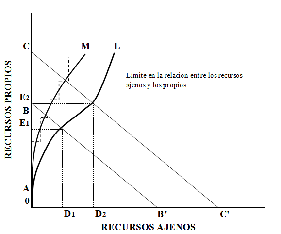 Por tanto, la curva 0AL de la Figura 2, muestra la relación entre los recursos ajenos y propios, la misma que transita por las rectas del presupuesto de capital (0B - 0B' y 0C - 0C') y cuyo costo mínimo de financiación es 0AM que incluye las combinaciones de recursos propios y ajenos según la dimensión de la firma y que produce el costo mínimo de capital secuencial [24].