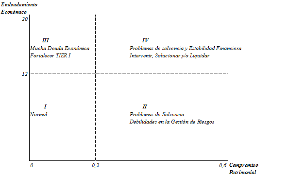 Donde los cuadrantes sugieren las medidas a adoptar en base a los cálculos efectuados, los mismos que se ajustan en base a los niveles de endeudamiento y la eficiencia financiera conseguida por las entidades financieras, conducente a establecer el riesgo potencial para los depositantes [27].