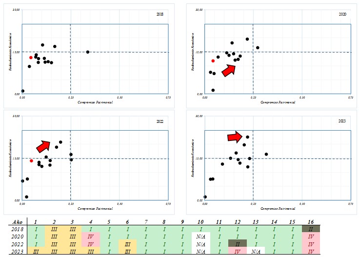 Revisando la evolución de los resultados obtenidos, se observa que la entidad que no fortalece su gestión de riesgos oportunamente asume un riesgo de migración hacia el cuadrante IV, debido a un deterioro sistemático de su Patrimonio Económico acompañado por el incremento sostenido de los niveles de Endeudamiento que condicionan la recuperación de la posición financiera de manera orgánica.