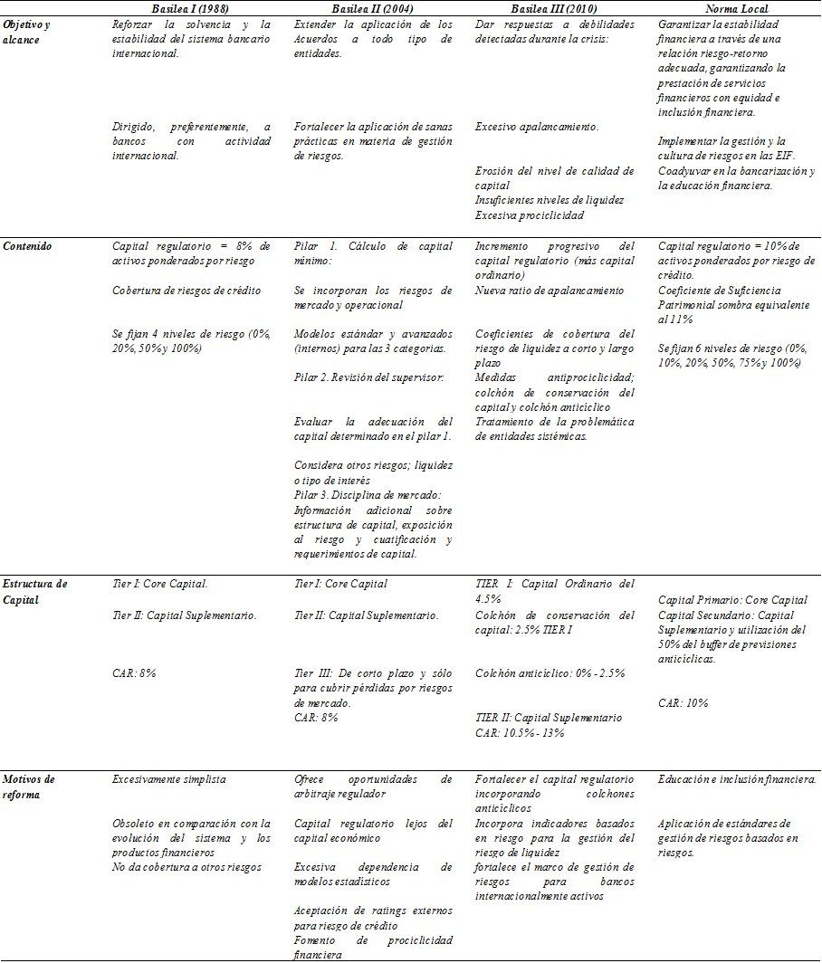 En este sentido, el Bank International Settlements (BIS) desde su creación en 19301 ha orientado parte de sus esfuerzos al diseño de directrices regulatorias [15], conocidas como sanas prácticas internacionales en materia de supervisión y regulación bancaria (Ver Tabla 1), con la finalidad de proporcionar lineamientos conducentes a fortalecer la estabilidad financiera global y local. Centrando su esfuerzo cuantitativo en el indicador de solvencia, ratio ajustado al riesgo (Figura 1) que se ha convertido en el principal mecanismo de control del sector bancario, materializado en los Acuerdos de Capital de Basilea [16].