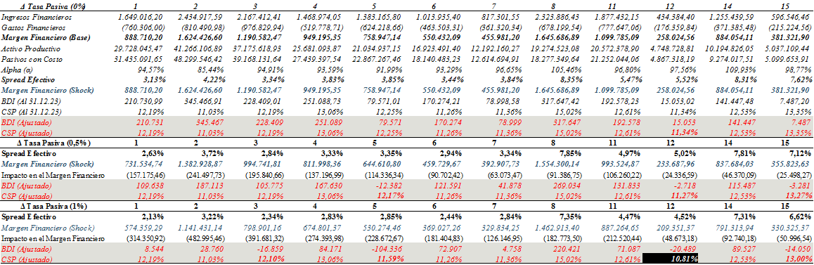 La posición corta en la posición para el IRRBB de la mayoría de los bancos analizados denota sensibilidad del Margen Financiero ante cambios bruscos en la tasa pasiva neta. Sin embargo, el efecto precio no genera shocks importantes a nivel de resultados.