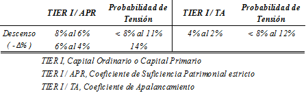 Por tanto, un coeficiente bajo entre capital ordinario y activos ponderados por riesgo se asocia claramente a la probabilidad de que las operaciones del banco reciban una calificación crediticia que equivalga a una situación de tensión o impago en el plazo de un año.
