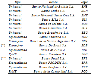 El presente trabajo de investigación tomó una muestra inducida conformada por 16 entidades bancarias, que aglutinan un total del 90% del Total de los Activos que administra el Sistema Financiero Boliviano, dichas EIF efectúan sus actividades en el marco de lo establecido en la Ley N° 393 y corresponde a la clasificación de bancos múltiples y PyME.