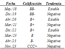 Sin embargo, la incertidumbre macroeconómica persiste, principalmente derivada por la persistente intervención del mercado cambiario por parte de la Autoridad Monetaria, con la consecuente pérdida de Reservas Internacionales Netas, que decantó en el deterioro de la calificación de riesgo de crédito de la deuda soberana en los mercados internacionales a la categoría de CCC+, para la calificadora S & P [6].
