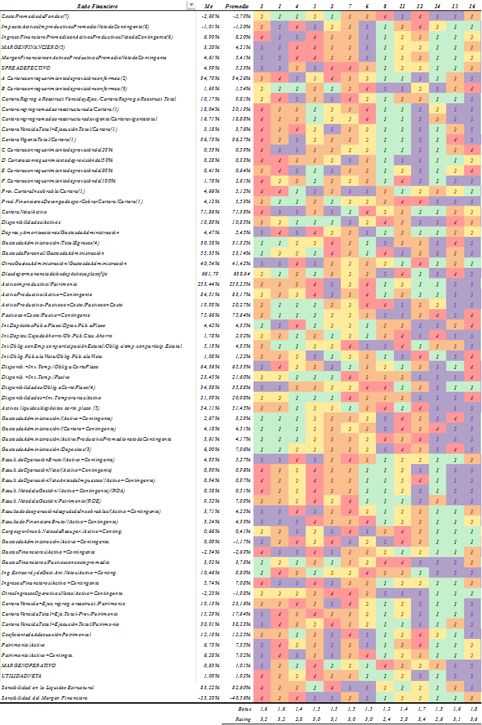 Los resultados obtenidos muestran que el banco 16avo presenta un rating CAMELS creciente y que necesita un proceso de regulación más cercano, resultado que tiene correlación con el de irregularidad financiera descrita en el punto anterior, situación que se torna similar para el caso del banco 12avo.