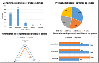 En relación con la figura 1 se evidencia que mayoritariamente el grado académico universitario tiene mayor porcentaje de habilidades digitales. Mientras que, el porcentaje de mayor productividad laboral la posee el rango de 20 a 25 años con 32%. Por otro lado, las dimensiones de las competencias digitales con mayor porcentaje se encuentra la resolución de problemas en masculinos en 63% y para los femeninos destaca la seguridad en 41%. Por último, en las dimensiones de la productividad laboral enfatiza la adaptabilidad y efectividad en el género masculino con 59%; mientras que, el género femenino destaca en la eficiencia con 61%.