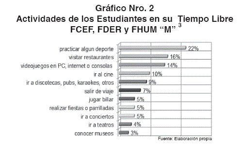 De manera general, entre las actividades que los estudiantes realizan con mayor preferencia, después de asistir a clases, se encuentran la práctica deportiva, seguida por la visita a restaurantes y el uso del internet y video juegos en computadora.