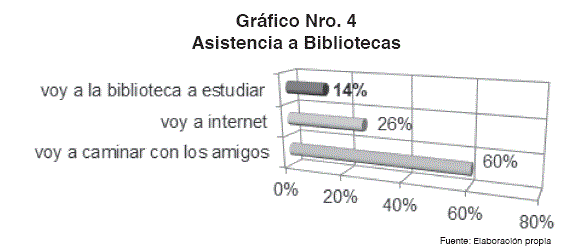Asistir a la biblioteca a leer, a investigar, es un aspecto que actualmente presenta menor recurrencia. La mayoría de los reducidos estudiantes que van a la biblioteca, no van a leer, sino a realizar trabajos de investigación en grupo, elaboración de prácticas o simplemente conversar, la lectura de libros es mínima.