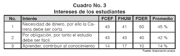 Los estudiantes manifiestan diversos intereses, los que categorizados se muestran en el cuadro No.3. Estos intereses se constituyen en objetivos que tienen los estudiantes al acudir a la universidad, situación que explica su comportamiento. Un estudiante que tiene el objetivo de aprender y ampliar el conocimiento, dedicara más tiempo a las actividades académicas, mientras que un estudiante que no tiene este objetivo, dedicará menos tiempo a éstas.